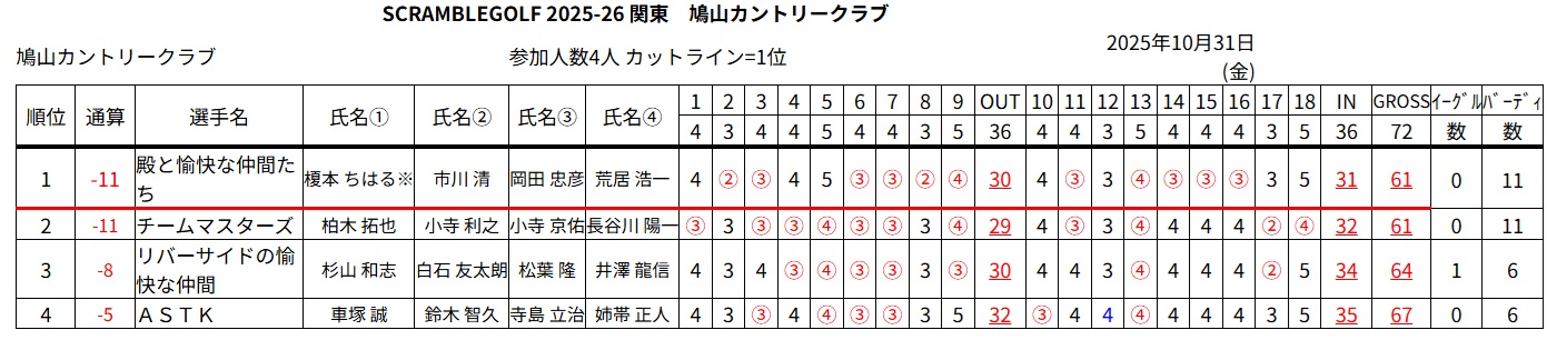 | 関東 | 予選1 | 10/31(金) | 鳩山カントリークラブ | 組合せ | 成績 |