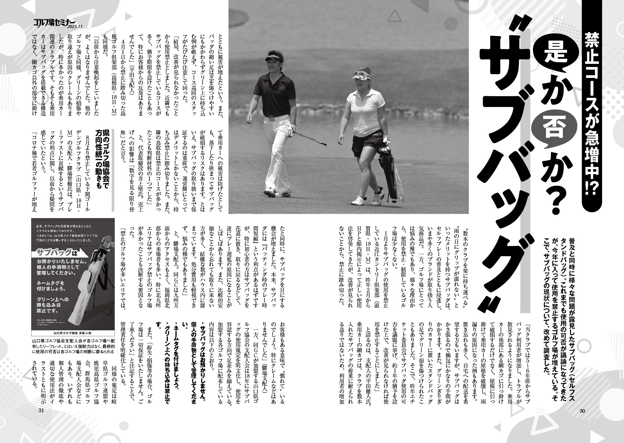 ![]() | 普及と同時に様々な問題が露見したサブバッグ(セルフスタンドバッグ)。これまでも使用の可否が議論になってきたが、今年に入って使用を禁止するゴルフ場が増えている。そこで、サブバッグの現状について、改めて調査した。 | ||