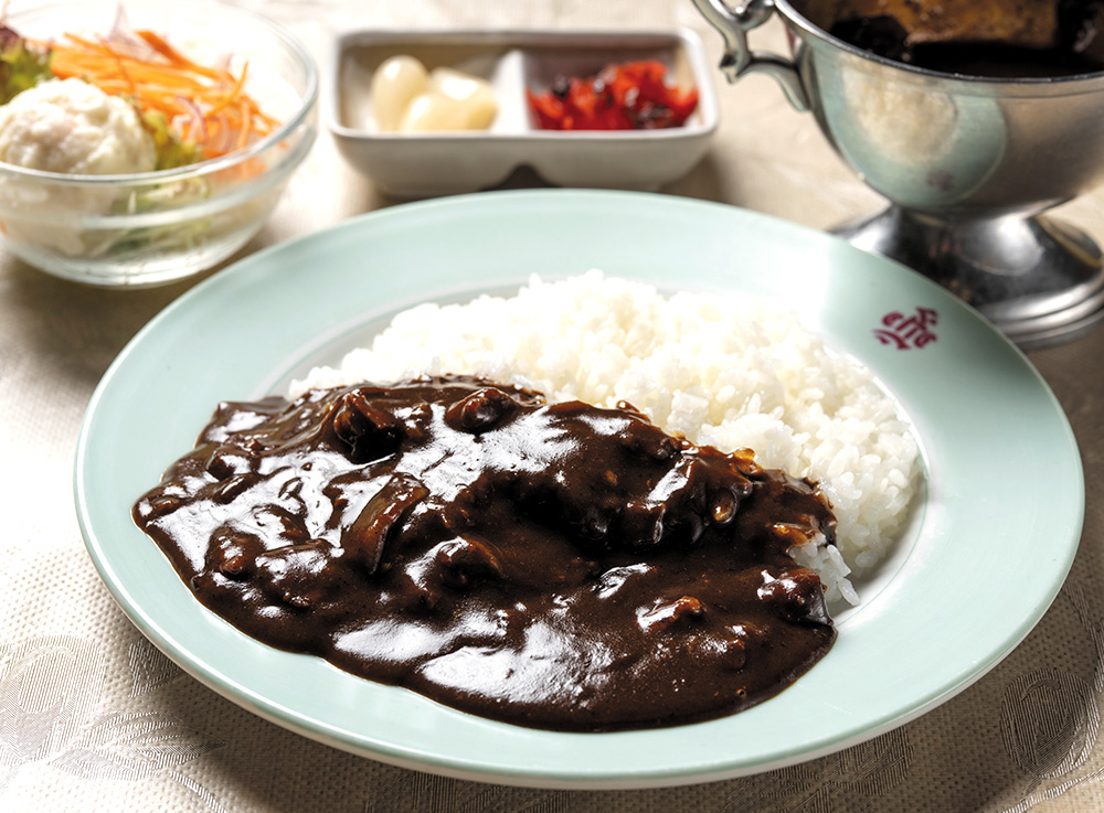 | 豚のモモとバラ肉のカレー。ルーはニンニクや生姜、各種香辛料をマーガリンで炒めたものにカレー粉を入れ、さらに手作りの鶏がらスープを合わせる。季節のサラダとらっきょう、福神漬けの付け合わせは、開場当初から変わらない。 | |||