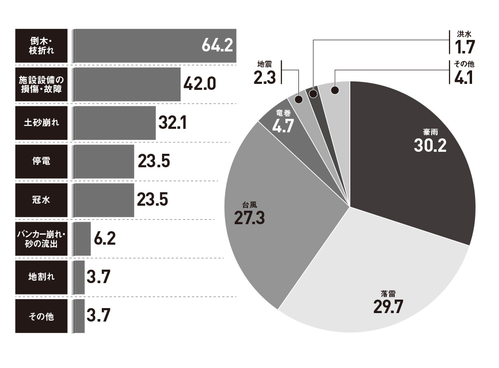 | 異常気象による影響で、近年は梅雨時から秋頃にかけて各地で線状降水帯が発生したり、大型の台風が襲来して河川の氾濫や土砂災害など甚大な被害を及ぼしている。ゴルフ場でも土砂崩れが発生して修復作業に追われることも少なくない。そこで、2021年以降にゴルフ場で被害があった自然災害や、各ゴルフ場で実施している災害対策について調査した。 | |||