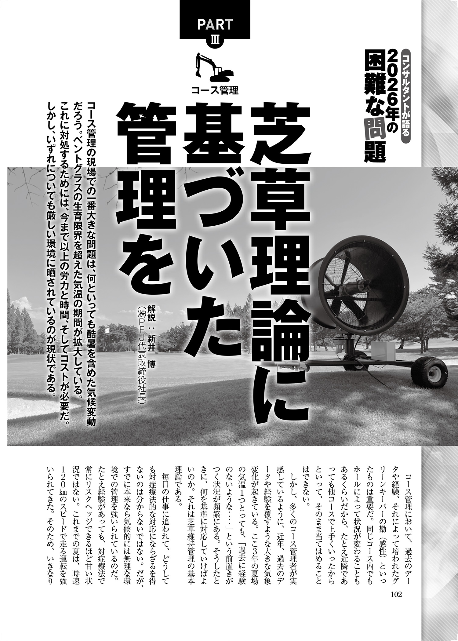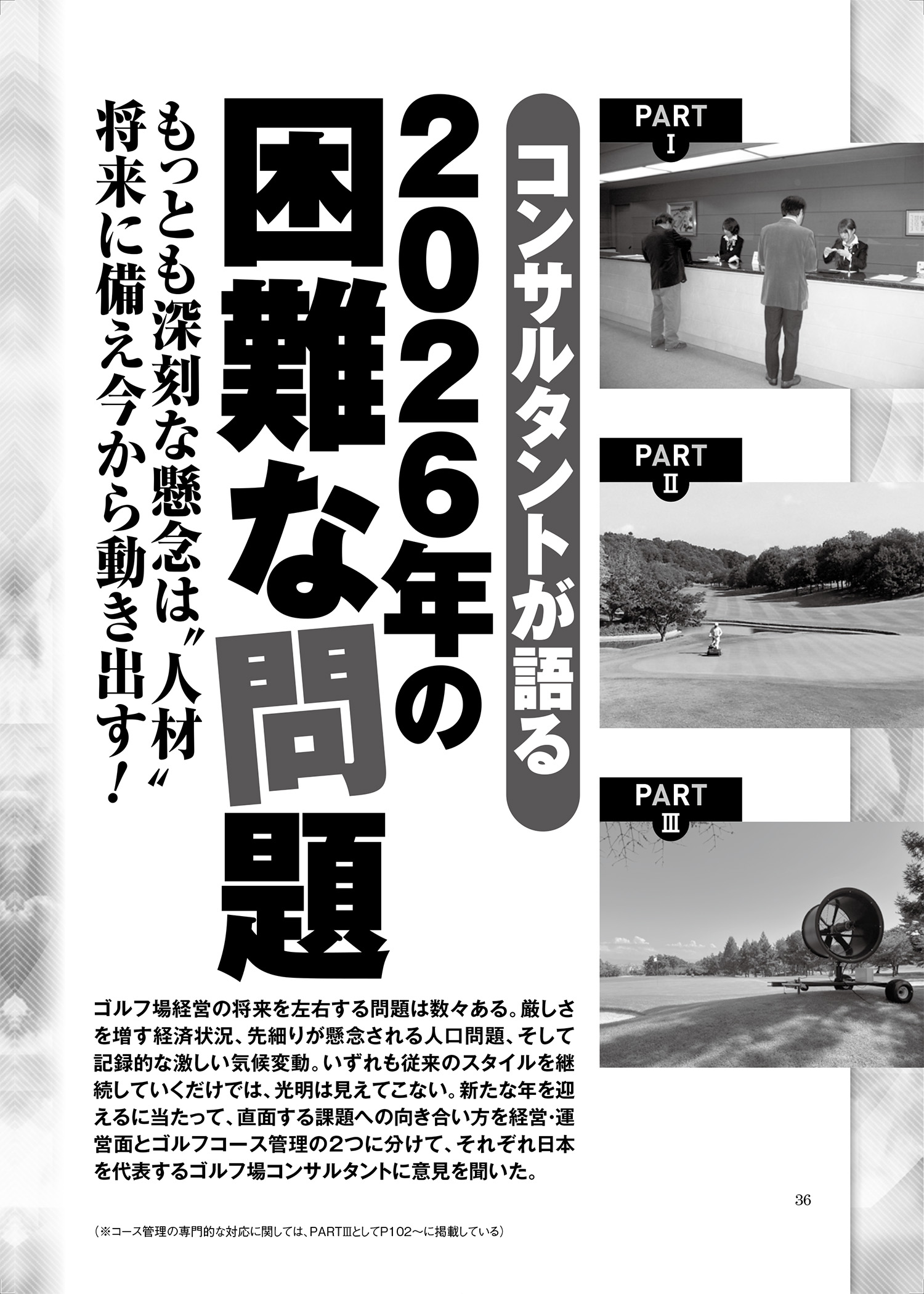 ゴルフ場経営の将来を左右する問題は数々ある。厳しさを増す経済状況、先細りが懸念される人口問題、そして記録的な激しい気候変動。いずれも従来のスタイルを継続していくだけでは、光明は見えてこない。新たな年を迎えるに当たって、直面する課題への向き合い方を経営・運営面とゴルフコース管理の2つに分けて、それぞれ日本を代表するゴルフ場コンサルタントに意見を聞いた。