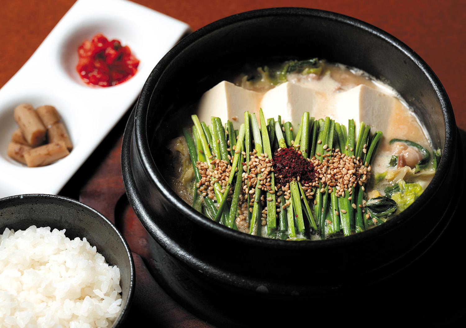 1人用鍋で提供される、冬の人気メニュー。国産牛の小腸を使用し、ニラ、キャベツ、豆腐、ゴボウなどが入る。一見、博多のもつ鍋にも見えるが、醤油ベースではなく、ニンニクの効いたスープは味噌ベース。ひと口すすれば濃厚な味わいとともに体がポカポカに。