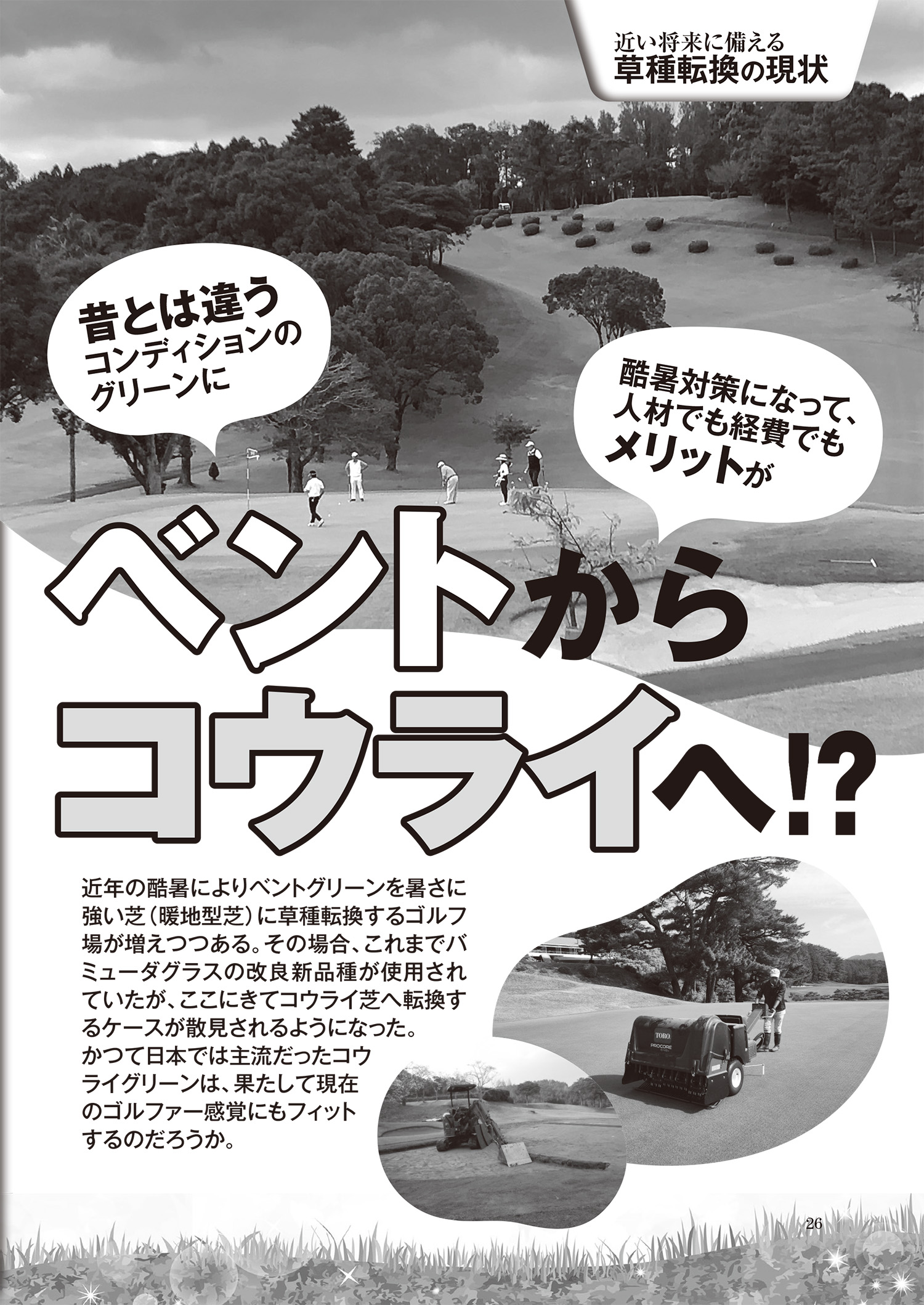 近年の酷暑によりベントグリーンを暑さに強い芝(暖地型芝)に草種転換するゴルフ場が増えつつある。その場合、これまでバミューダグラスの改良新品種が使用されていたが、ここにきてコウライ芝へ転換するケースが散見されるようになった。かつて日本では主流だったコウライグリーンは、果たして現在のゴルファー感覚にもフィットするのだろうか。